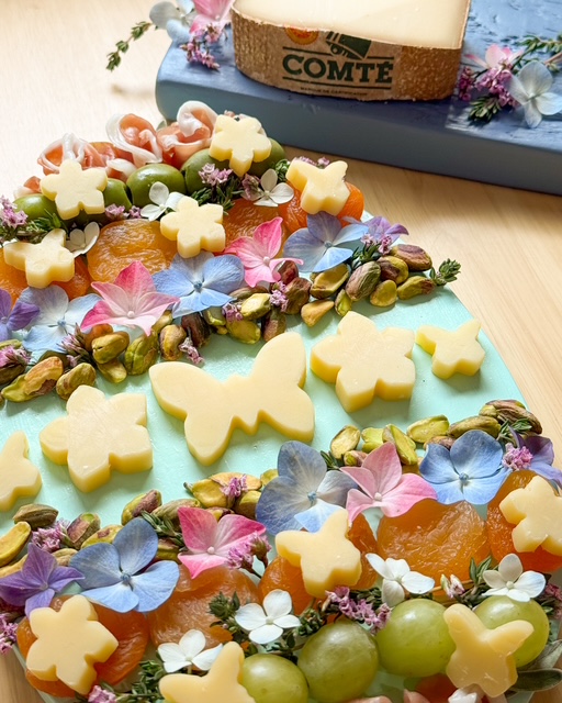 Especially if you love Comté! We used festive cookie cutters on the Comté cheese, and then added prosciutto rosettes, Castelvetrano olives, dried apricots, pistachios, green grapes, and garnished with fresh thyme, sage, and florals.